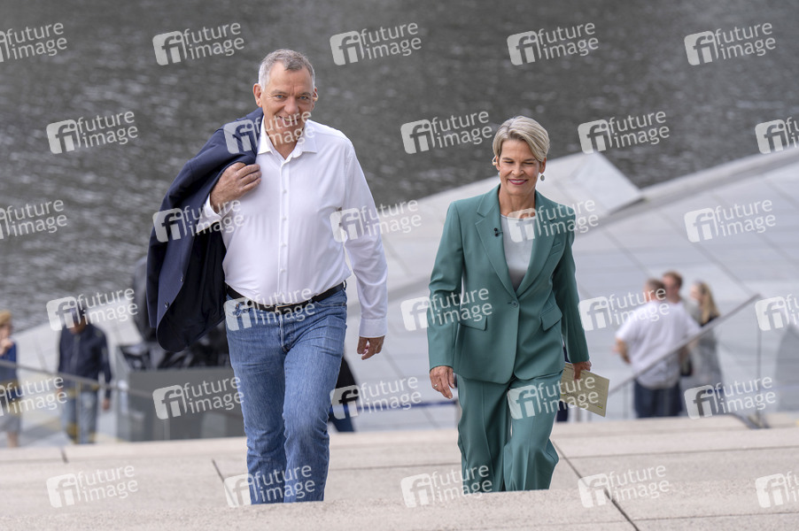 Jan van Aken und Anna Engelke beim ARD-Sommerinterview auf der Terrasse vom Marie-Elisabeth-Lüders-Haus. Berlin, 17.08.2025