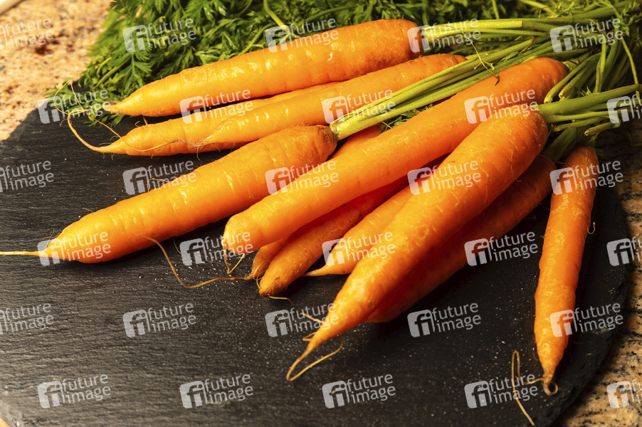 Essen, Nahrung, Speise, Ernährung, Gemüse, Karotte, Möhre, Mohrrübe, Gelbrübe, Gelbe Rübe, Rüebli, Riebli, Wurzel, Doldenblütler, Apiaceae, Gemüsepflanze, Daucus carota, Karottengrün, Karottenkraut, Möhrengrün, Symbolbild, Themembild