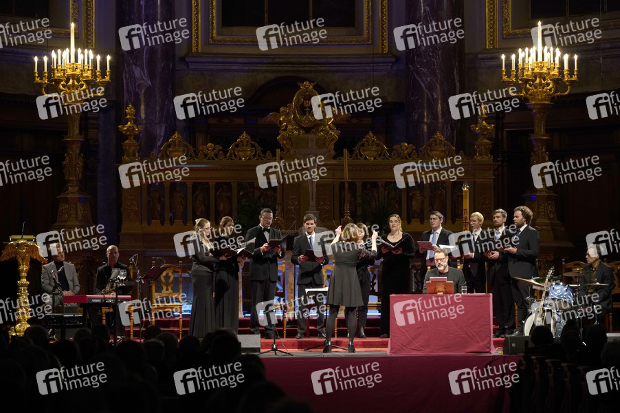 Sebastian Koch mit dem Chor Vocalis Ensemble Dresden und dem Jazztrio Dresden bei der Weihnachtslesung 'Und lauscht hinaus den weißen Wegen' im Rahmen der Lesereihe 'Meisterhaftes aus dem Berliner Dom' im Berliner Dom. Berlin, 26.11.2022