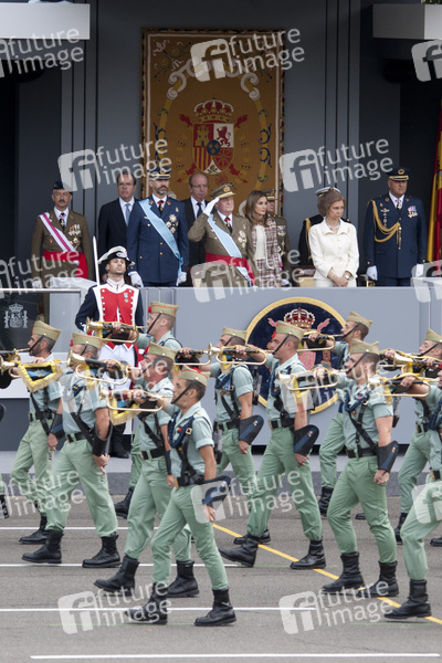 Die spanische Königsfamilie bei der Hommage an die Nationalflagge mit Militärparade am Palacio Real, Madrid