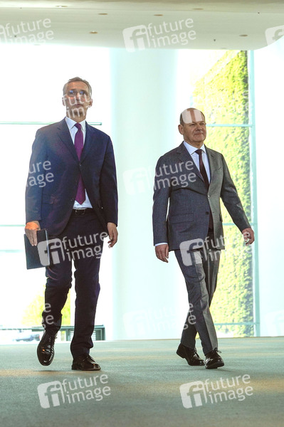 Jens Stoltenberg und Olaf Scholz beim Empfang des NATO-Generalsekretärs zu einem gemeinsamen Gespräch mit dem Bundeskanzler mit anschließendem Pressestatement im Bundeskanzleramt. Berlin, 26.04.2024
