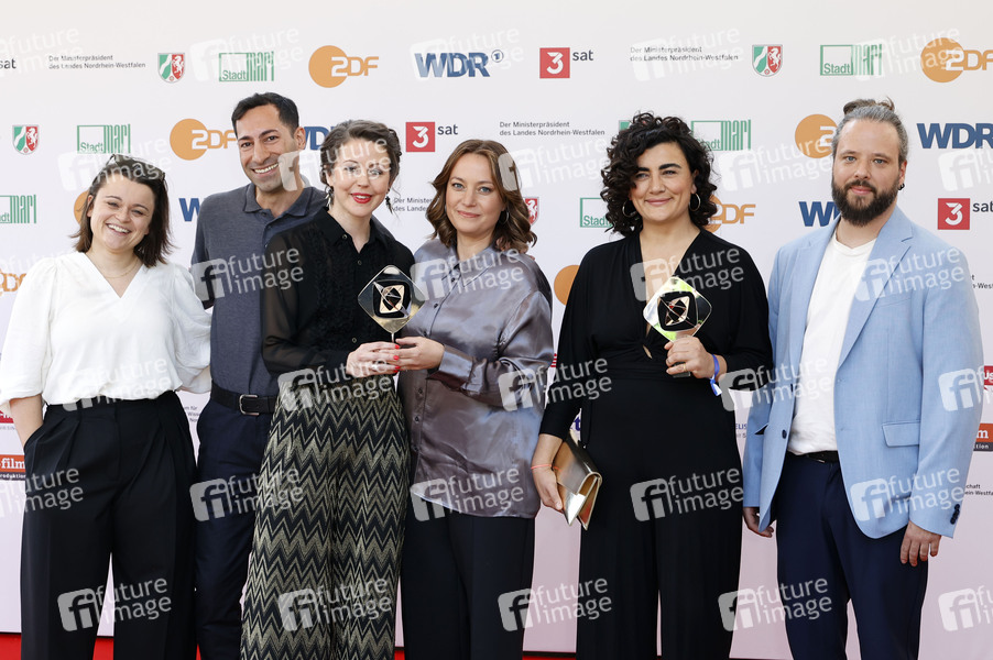Sara Günter, Arash Asadi, Meret Madörin, Antonia Kilian, Bahar Bektas und Tobias Carlsberg bei der 61. Verleihung des Grimme Preises 2025 im Theater Marl. Marl, 04.04.2025