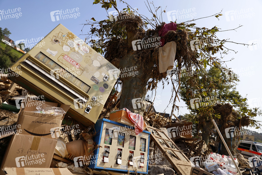 Nach dem Jahrhunderthochwasser in der Eifel durch heftige Regenfälle und Dauerregen mit Überschwemmungen und Überflutungen haben die Aufräumarbeiten im Ahrtal begonnen. Einheiten von Polizei, THW, Bundeswehr und Feuerwehr mitsamt vielen freiwilligen Helfern räumen Straßen, entfernen Schutt und Schlamm und versorgen die Menschen. Im Bild Flutschäden in der Ortschaft Altenahr, in der die Flut viele Häuser zerstörte, 22.07.2021