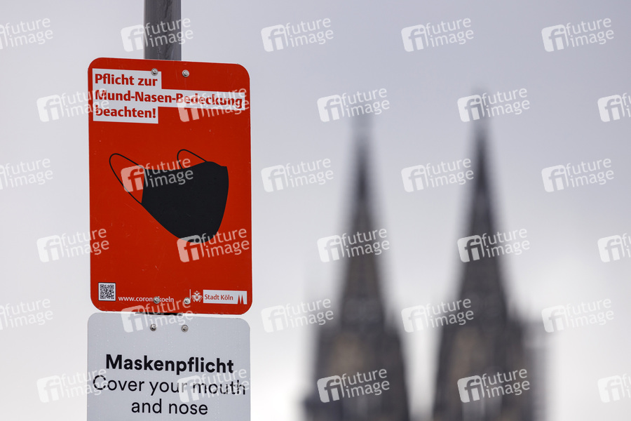 Maskenpflicht, Masken, Maske tragen, Mund-Nasen-Bedeckung, Mund-Nasen-Schutz, MNS, FFP2, medizinische Masken, Stoffmasken, Behelfsmasken, Corona, Virus, Coronavirus, Coronaviren, Schild, Hinweis, Hinweisschild, Corona-Maßnahmen, Corona-Politik, Coronamaßnahmen, Corona-Regeln, Coronaregeln, Kölner Dom, dritte Welle, zweite Welle, Kontaktbeschränkungen, Kontaktverbot, Corona-Kontrollen, Ordnungswidrigkeit, Grenzwert, Grenzwerte, Inzidenz, Inzidenzwert, Inzidenzwerte, Gesundheit, Hygiene, Neuinfektionen, R-Wert, Inzidenzzahl, Maskenzwang, Infektionsschutzgesetz, Infektionsschutz, 7-Tage-Inzidenz, Gesundheitspolitik, Zeitgeschichte, Corona-Auflagen, Lockdown, Lock Down, Symbolbild, Symbolfoto