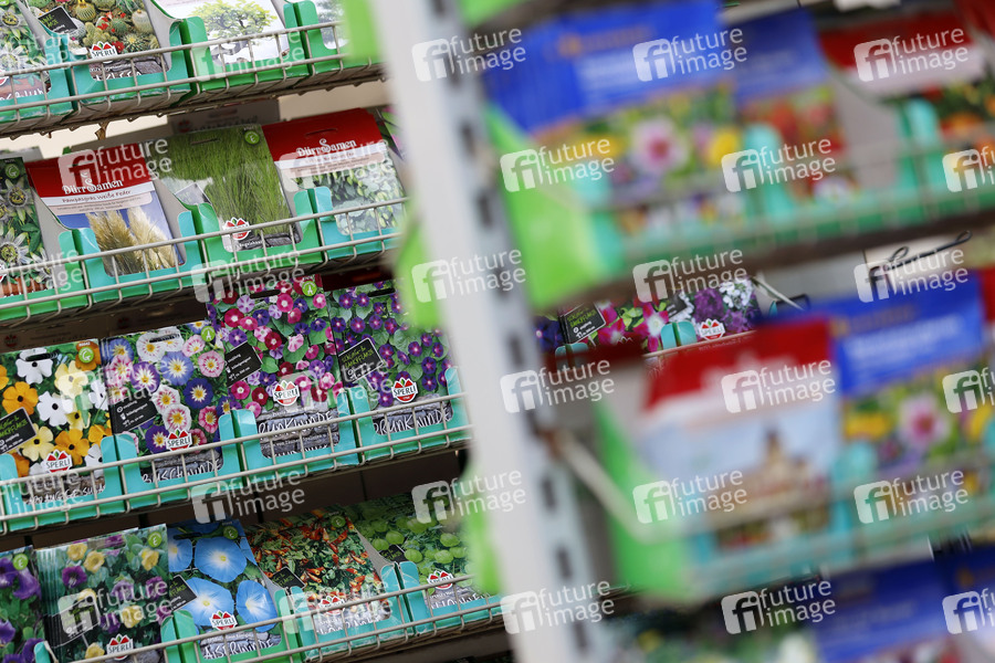 Ein Regal mit Saattüten an einem Floristengeschäft. (Themenbild, Symbolbild) Bonn, 28.04.2021