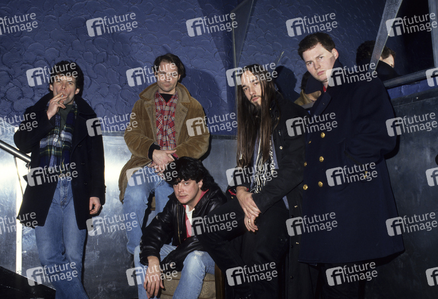 Gord Sinclair, Gord Downie, Paul Langlois, Rob Baker und Johnny Fay von The Tragically Hip bei einem Photoshooting im Kaiserkeller. Hamburg, 10.08.1990