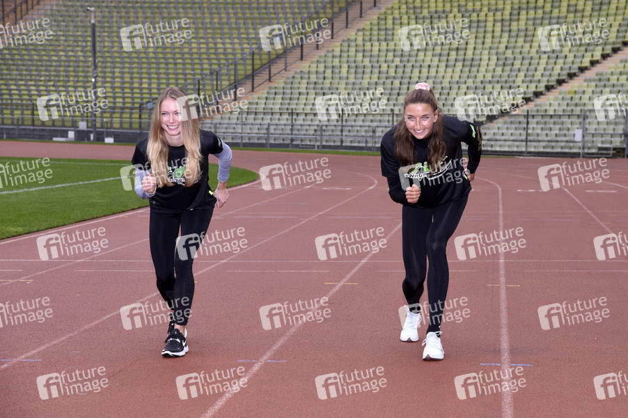 Katharina Trost und Christina Hering beim Fototermin zur sportichen '#WocheChallenge' im Olympiastation München. Unter dem Motto 'Wir können was bewegen!' ruft die Welthungerhilfe zu dieser Challenge auf und bittet um Spenden für eine Welt ohne Hunger. München, 13.10.2020