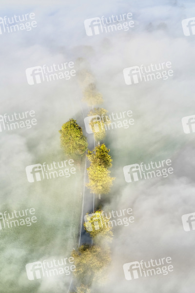 Morgennebel, Nebel, Hochnebel, vernebelt, Sichtweite, Wettervorhersage, eingeschränkte Sicht, diesig, schlechte Sicht, Sichtbehinderung, Wetter, Verkehr, Unfallgefahr, Kondensation, Luftaufnahme, Luftbild, Drohne, Drohnenaufnahme, Symbolbild, Symbolfoto