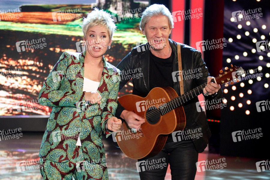 Inka Bause und Johnny Logan bei der Fernsehshow 'Inka Bause Live' in der Erdgasarena. Riesa, 01.03.2013