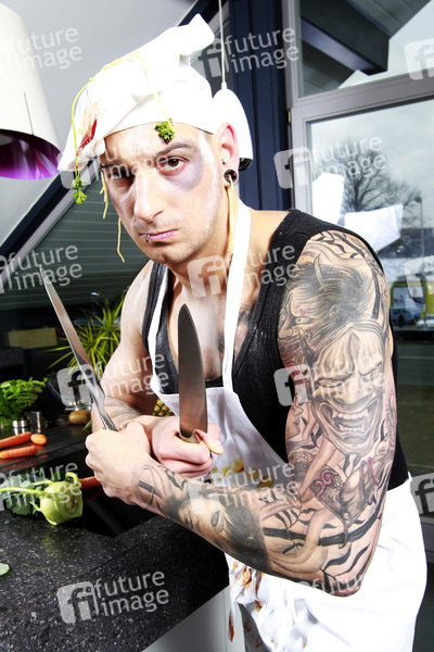 SOLsnap Cover-Model März 2012, Küche, Koch, Chef de Cuisine, Messer, Tattoo, Tätowierung