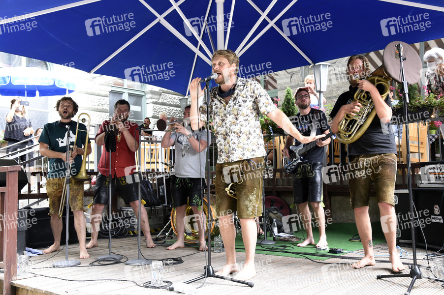 LaBrassBanda bei einem Konzert im Rahmen der Biergarten-Tour unter dem Motto 'Rettet die Wirte & die Kultur' im Hofbräukeller. München, 25.07.2020