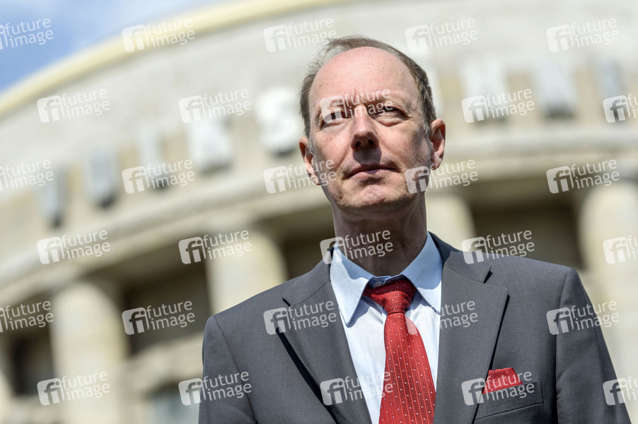 Martin Sonneborn beim Pressetermin zum Auftakt der Wahlkampagne 'Die PARTEI - für Europa reicht's' der Satirepartei Die PARTEI zur Europawahl 2019 vor der Volksbühne Berlin. Berlin, 23.04.2019