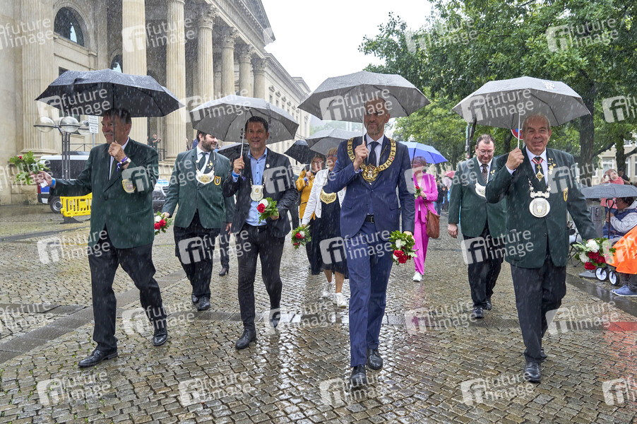Paul-Eric Stolle (Präsident des Verbandes hannoverscher Schützenvereine), Belit Onay (Oberbürgermeister Hannover), Steffen Krach (Regionspräsident Region Hannover) und Uwe Weimann (Präsident Niedersächsischer Sportschützenverband e.V.) beim Schützenausmarsch zum 495. Schützenfest in der Innenstadt. Hannover, 30.06.2024