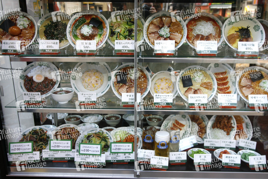 Muster von Gerichten aus Kunststoff vor Restaurant