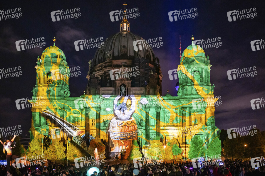 Der Berliner Dom am Lustgarten auf der Museumsinsel. Das Festival of Lights Berlin gehört zu den bekanntesten Lichtfestivals weltweit. Es ist ein kostenloser Event in Berlin, der jährlich im Herbst stattfindet und 10 Tage lang bekannte Berliner Sehenswürdigkeiten durch Illuminationen, lichtkünstlerische Projektionen und 3D-Mappings aufwändig in Szene setzt. Berlin, 06.10.2024