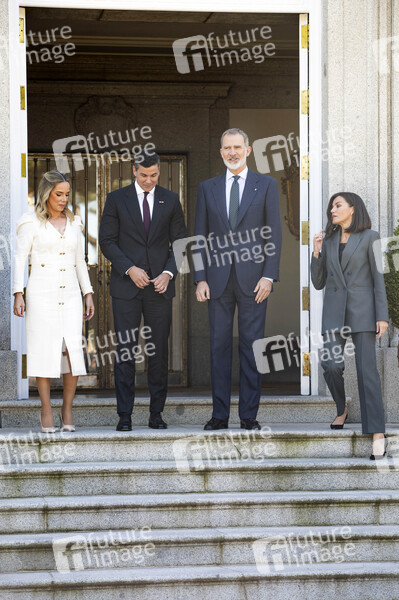 Santiago Pena mit Ehefrau Leticia Ocampos, König Felipe VI. von Spanien und Königin Letizia von Spanien beim Fototermine anlässlich eines gemeinsamen Essens im Palacio de la Zarzuela. Madrid, 28.02.2024