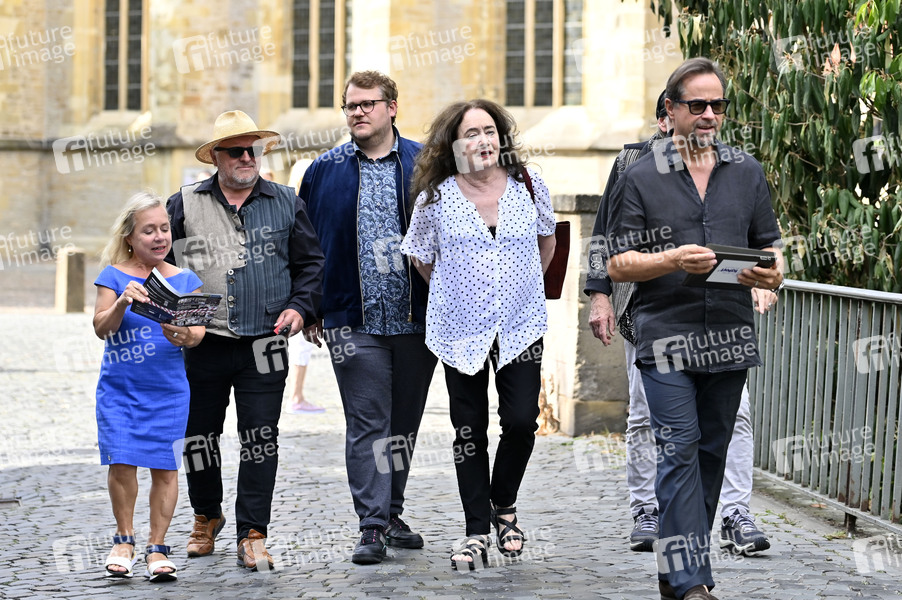 ChrisTine Urpruch, Axel Prahl, Björn Meyer, Mechthild Großmann, Claus D. Clausnitzer und Jan Josef Liefers beim Presserundgang 'Spurensuche Tatort Münster' an original Drehorten mit dem Tatort-Cast zum 20 jährigen Jubiläum des Münsteraner Tatorts. Münster, 30.08.2022