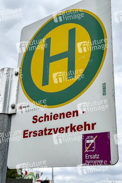Im Rahmen von Streckenmodernisierungen oder Störungen des Eisenbahnbetriebes, richtet die Bahn einen Schienen-Ersatzverkehr mit Bussen ein. Hierdurch verlängert sich die Reisezeit oft erheblich zum Beispiel durch Verkehrsstaus auf den Straßen. Die Bushaltestellen zum Schienen-Ersatzverkehr werden in den Bahnhöfen durch auffällige Hinweisbanner und Schilder hingewiesen. (Symbolfoto, Themenfoto) Köln, 17.05.2025
