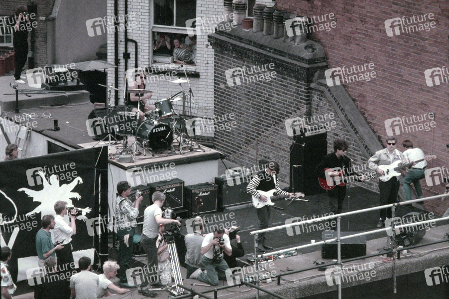 Pete de Freitas, Will Sergeant, Ian McCulloch und Les Pattinson von Echo & the Bunnymen live bei einem Rooftop-Konzert zum 20 jährigen Jubiläum des Beatles-Albums 'Sgt. Pepper’s Lonely Hearts Club Band' auf dem Dach vom HMV Record Store in der Oxford Street. London, 06.07.1987