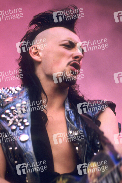 Geoff 'Cobalt Stargazer' Bird von Zodiac Mindwarp and the Love Reaction live auf dem Reading Rock Festival 1986 an der Richfield Avenue. Reading, 24..08.1986