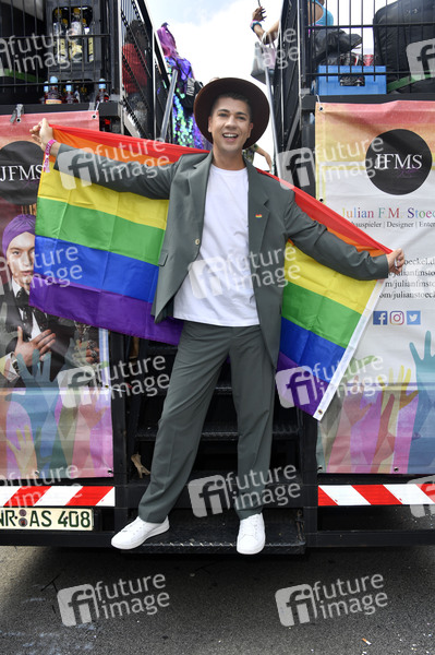 Maximillian Seitz auf dem JFMS Truck von Julian F. M. Stoeckel bei der 44. Christopher Street Day Parade 2022 unter dem Motto 'United in Love! Gegen Hass, Krieg und Diskriminierung' vom Spittelmarkt auf gut sieben Kilometern über Potsdamer Platz und Potsdamer Straße zum Nollendorfplatz, von dort weiter zur Siegessäule und zum Brandenburger Tor. Berlin, 23.07.2022