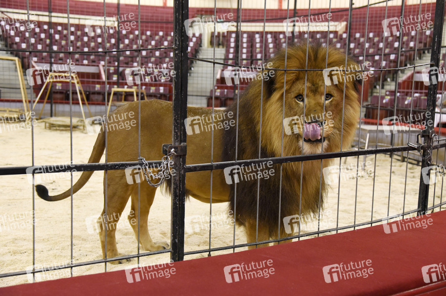 Löwe beim Pre-Presse-Empfang mit kommentierten Raubtiertraining im Circus Krone Bau. München, 26.06.2020