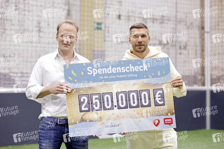 Marketingchef Clemens Bauer und Lukas Podolski bei der Übergabe der Spende von 250.000 Euro aus der REWE Jackpot Aktion an die Lukas Podolski Stiftung in der Strassenkicker Base. Mit dem Großteil des gesammelten Geldes wird der Bau eines modernen Straßenkicker-Courts in Köln Müngersdorf unterstützt. Der darüber hinaus gehende Spendenbetrag fließt als Fördermittel in weitere soziale Projekte der Lukas Podolski Stiftung, vor allem in den Aufbau und die Unterstützung sportbasierter Bildungsprojekte für Jugendliche und Schulen in der Soccer Halle 'Strassenkicker Base' in Köln-Mühlheim (Quelle: https://fuerdenfussball.rewe.de/). Köln, 01.07.2021