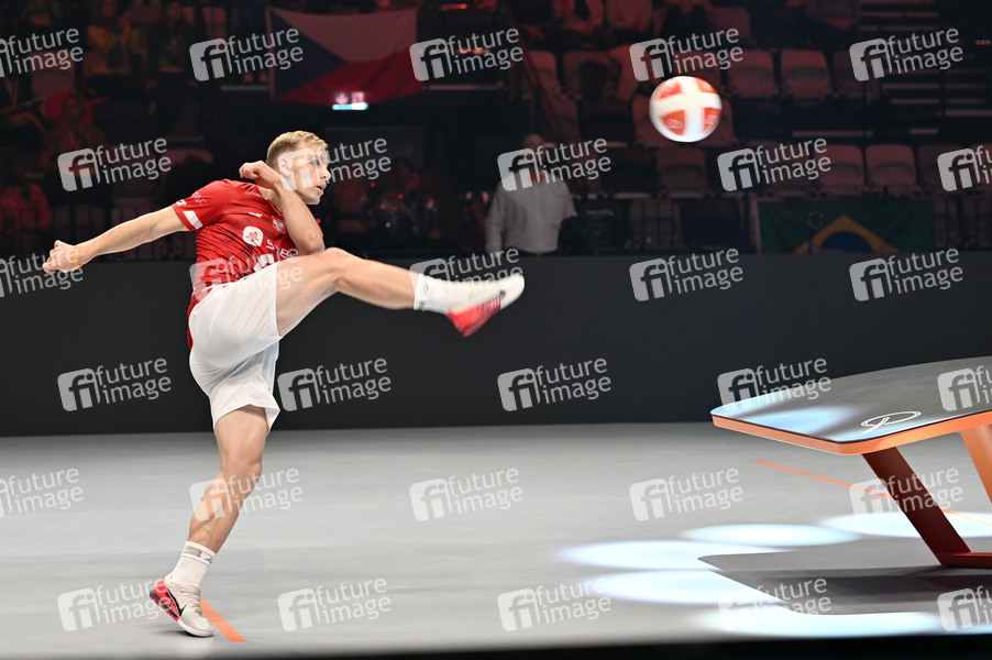 Adrian Duszak (Polen) beim Man Single Finale Rumanien vs Polen bei der Teqball Weltmeisterschaft 2022 in der Kia Metropole Arena. Nürnberg, 27.11.2022