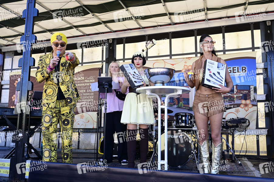 Julian F.M. Stoeckel, Pauline Stolze und Micaela Schäfer bei der Party zum 15. Firmenjubiläum der Eierlikörfabrik am Firmensitz der scharfesGELB-Manufaktur. Senftenberg, 01.05.2025