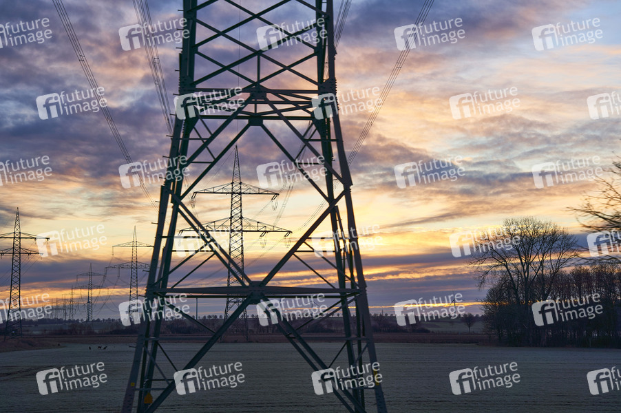 Strommasten und Windräder bei Sonnenaufgang. Gleidingen, 20.03.2021