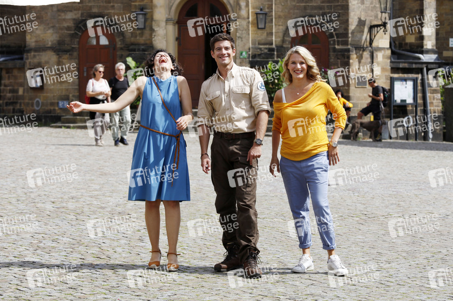 Liza Tzschirner, Philipp Danne und Eva-Maria Grein von Friedl am Set des ARD-Fernsehfilms 'Der Ranger - Paradies Heimat' auf dem Marktplatz. Stadt Wehlen, 14.08.2019