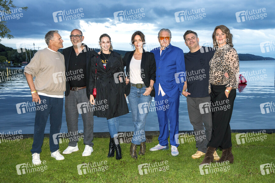 Christian Tramitz, Hannes Ringelstetter, Mitsou Jung, Katharina Müller-Elmau, Michael Brandner, Paul Sedlmeir und Susu Padotzke bei der Premiere von zwei neuen Folgen der ARD-Vorabendserie 'Hubert ohne Staller' auf dem Open Air Starnberg 2025 im Open Air Kino im Seebad. Starnberg, 05.08.2025