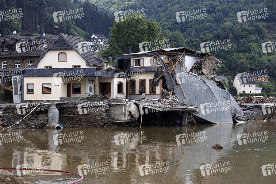 Nach dem Jahrhunderthochwasser in der Eifel durch heftige Regenfälle und Dauerregen mit Überschwemmungen und Überflutungen haben die Aufräumarbeiten im Ahrtal begonnen. Einheiten von Polizei, THW, Bundeswehr und Feuerwehr mitsamt vielen freiwilligen Helfern räumen Straßen, entfernen Schutt und Schlamm und versorgen die Menschen. Im Bild Häuser und Treibgut in der Ortschaft Rech, in der die Flut viele Häuser zerstörte, 22.07.2021