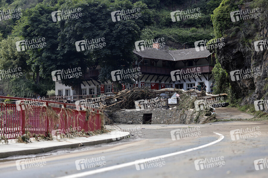 In der Eifel haben heftige Regenfälle und Dauerregen für Überschwemmungen und Überflutungen gesorgt. Im Ahrtal trat der Fluss vielerorts über die Ufer und überschwemmte nicht nur Keller sondern ganze Ortschaften. Im Bild die Straße zwischen Dernau und Walporzheim, die von den Fluten auf einem Abschnitt einfach mitgerissen wurde. Dernau, 15.07.2021