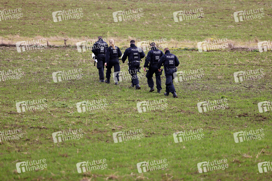 Kohlegegner wie Mitglieder von Greenpeace, Fridays for Future und linksradikalen Gruppen wie der Antifa haben in Lützerath gegen den Tagebau protestiert. Das kleine Dorf an der Kante von Garzweiler soll dem Braunkohleabbau weichen. Allerdings will der Energiekonzern RWE vorerst auf den Abriss verzichten. Im Bild Polizisten verloren auf einem Feld bei der Demo gegen den Abriss. Lützerath, 31.10.2021