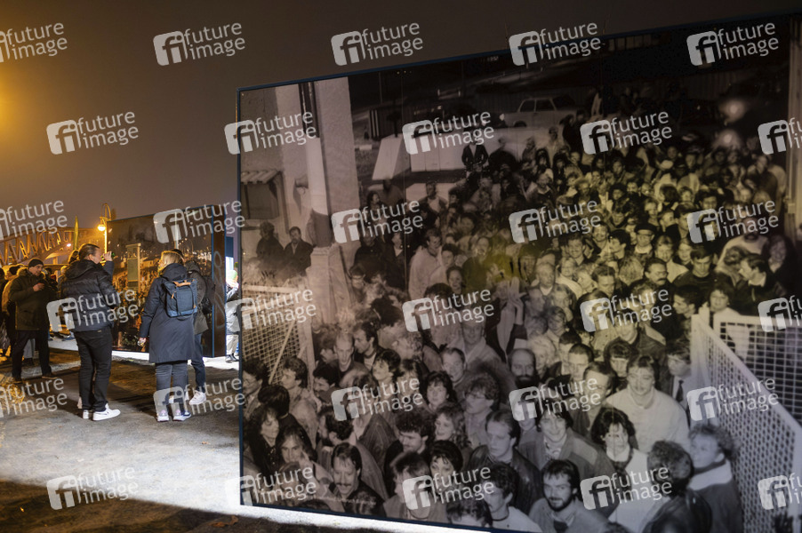 Anlässlich des 35. Jahrestags des Falls der Berliner Mauer Mauer versammeln sich Anwohner und Besucher an der Bornholmer Straße in Höhe der Bösebrücke um an den Mauerfall zu erinnern. Hier befand sich der Grenzübergang, an dem am 9.November 1989 die Grenz nach Westerberlin als erstes geöffnet wurde. Ein kleine Ausstellung erinnert daran. Berlin, 09.11.2024