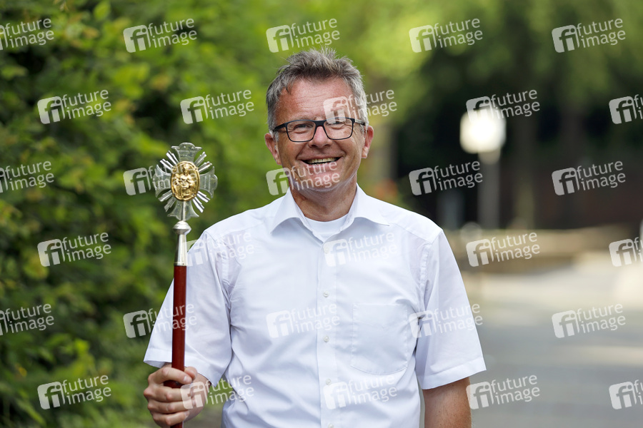 Klaus Koltermann bei einer Kundgebung auf dem Börsenplatz, bei der Gläubige aus dem Erzbistum Köln und Aktivisten der Bewegung Maria 2.0 das Verhalten der Kirche und Erzbischof Rainer Maria Kardinal Woelki bei der Aufarbeitung des Missbrauchskandal kritisieren. Am Nachmittag trifft auch eine Pilgergruppe von Pfarrer Klaus Koltermann aus Dormagen Nievenheim mit 60 Christen nach 40 Km Fußmarsch unter dme Motto 'Aufbruch nach Köln' auf dem Börsenplatz ein. Koltermann hat sich als einziger Pfarrer in Deutschland für den Rücktritt von Kardinal Woelki ausgesprochen. Köln, 12.06.2021