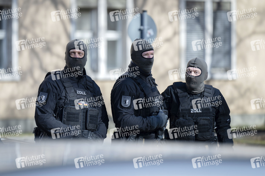 Vorführung eines Zugriffs durch Zoll-Einsatzkräfte nach der Pressekonferenz zur Vorstellung des Aktionsplans gegen Organisierte Kriminalität im Zollfahndungsamt Berlin-Brandenburg. Berlin, 25.02.2026