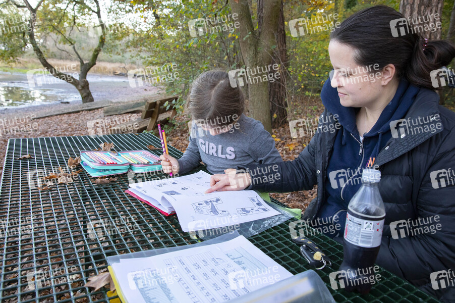 Eine Mutter hilft ihrer Tochter bei den Hausaufgaben im Freien am Scheuermühlenteich. Hausaufgaben machen und Lernen an der frischen Luft dient der Abwechselung vom häuslichen Alltag. (Symbolbild, Themenbild, Model Release) Köln, 09.11.2020