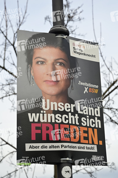 Wahlplakat des BSW mit Sahra Wagenknecht zur Bundestagswahl 2025 in Radeberg. Radeberg, 24.01.2025