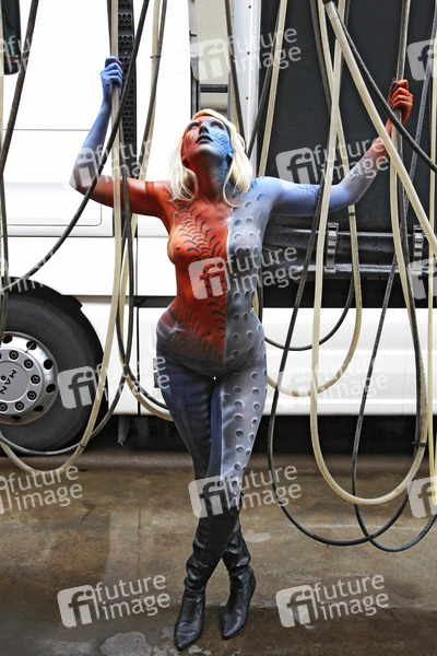 Bodypainting und Photoshooting mit Model Anastasia in einer Auto- und LKW-Waschanlage in Lauenau. Bodypaint Künstler: Jörg Düsterwald
