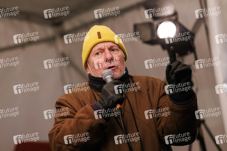 Jürgen Becker bei der Solidaritätsaktion mit Obdachlosen am Kölner Hauptbahnhof. Die Vereine 'Helping Hands' und die Sozialistische Selbsthilfe Mülheim (SSM) haben unterstützt von der Initiative 'Arsch Huh' am Wochenende dazu eingeladen, in einer Solidaritätsaktion drei Nächte am Hauptbahnhof zu übernachten. Köln, 03.12.2021