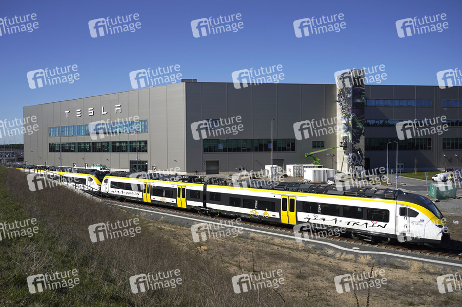 Die Tesla Gigafactory Berlin-Brandenburg ist eine Großfabrik von Tesla im Ortsteil Freienbrink der märkischen Gemeinde Grünheide. Sie befindet sich rund 30 Kilometer Luftlinie südöstlich vom Zentrum Berlins. Es handelt sich um eine der größten Elektroauto-Fabriken in Deutschland und die erste des US-Herstellers in Europa. Der erste vollelektrische, batteriebetriebene Zug Giga Train befördert Passagiere vom Bahnhof Erkner nach Tesla Süd, dem Bahnhof am Produktionsstandort des Unternehmens. Grünheide, 04.04.2025