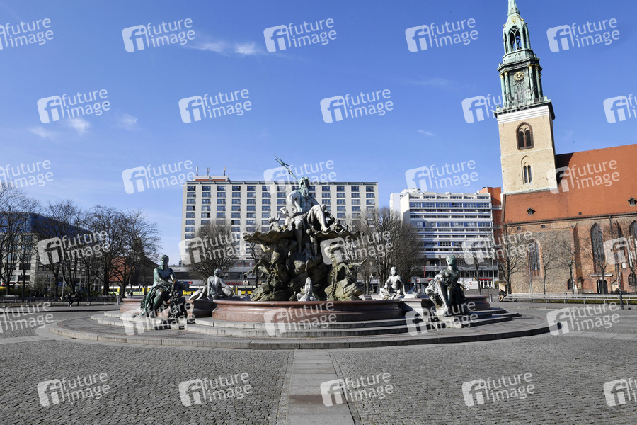 Der Neptunbrunnen. Nach zuletzt beschlossenen Schutzmaßnahmen gegen die Ausbreitung des Corona-Virus kommt das öffentliche Leben in Berlin nahezu zum Erliegen. Betroffen sind fast alle Sehenswürdigkeiten, Museen, Plätze, Strassen, Restaurants, Biergärten, Universitäten u.v.m. Berlin, 17.03.2020