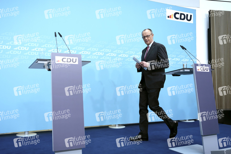 Friedrich Merz bei der Pressekonferenz zu den Ergebnissen der Gremiensitzungen der CDU im Konrad-Adenauer-Haus. Berlin, 09.03.2026