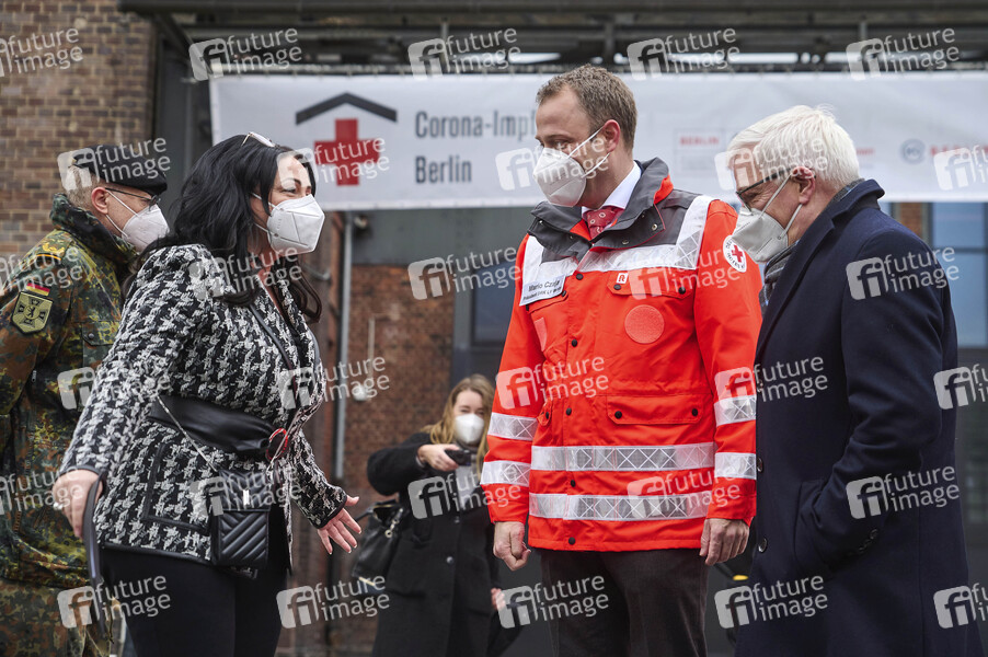 Berlins Gesundheitssenatorin Dilek Kalayci, Mario Czaja (Präsident Berliner Landesverband Deutsches Rotes Kreuz, DRK) und Dr. med. Burkhard Ruppert (Kassenärztliche Vereinigung) bei der Inbetriebnahme des Corona-Impfzentrums in der Arena Berlin. Berlin, 27.12.2020