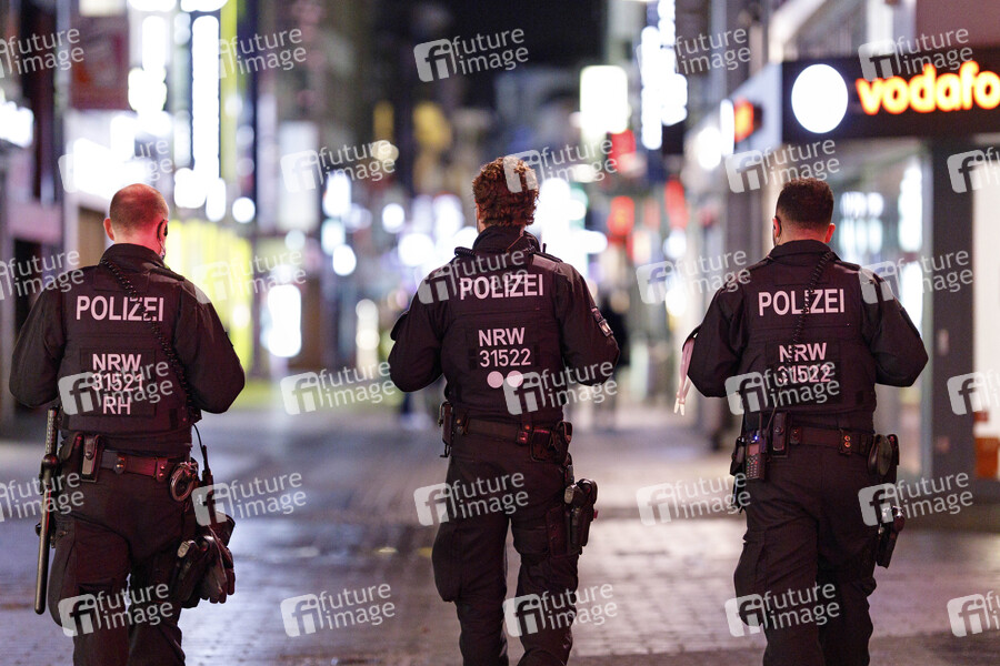 Wegen der Corona-Pandemie erfolgte Corona-Kontrollen aus dem vergangenen Jahr werden der Stadt Köln voraussichtlich mehrere hunderttausend Euro in die Kassen spülen. Buß- und Verwarngelder in Gesamthöhe von gut 609.000 Euro hat die Stadt bisher eingenommen. Im Bild eine Polizeistreife in der Fußgängerzone Hohe Straße, wo Corona-Regeln wie Maskenpflicht und Mindestabstand gelten. (Themenbild, Symbolbild) Köln, 01.02.2021