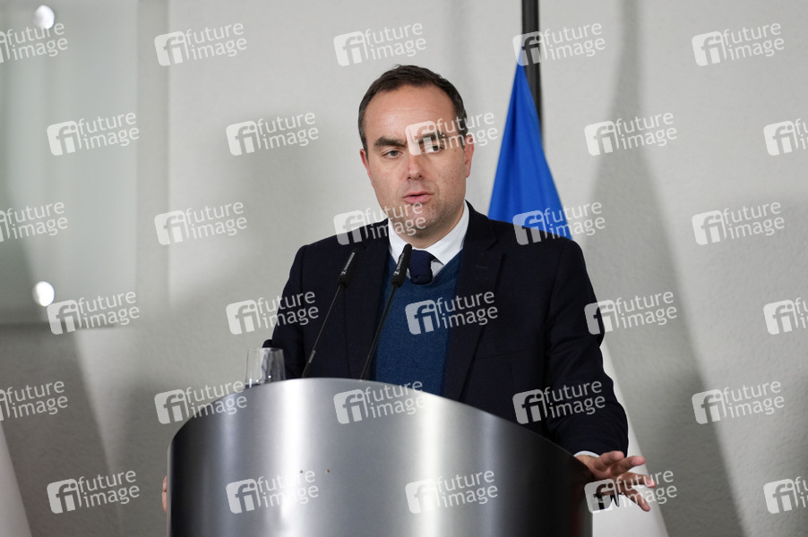 Sebastien Lecornu beim Treffen zum Gespräch mit drei Amtskollegen und einer Unterstaatssekretärin aus vier europäischen Ländern über die Stärkung der europäischen Sicherheit und Verteidigung mit anschließendem gemeinsamen Pressestatement im Bundesministerium der Verteidigung. Berlin, 25.11.2024