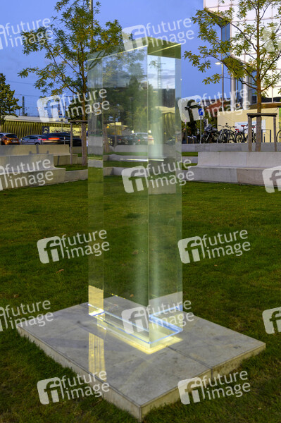 Kunstwerk 'Rolihlahla' (Unruhestifter) auf dem Nelson-Mandela-Platz. Ein Rohdiamant, der in einer durchsichtigen Acrylglasstele schwebt. Aus der Ferne kaum sichtbar, funkelt der Edelstein von Nahem im Licht. Das Künstlerinnenduo missing icons benannte ihr Kunstwerk nach Nelson Mandelas erstem Vornamen. Nürnberg, 14.10.2021