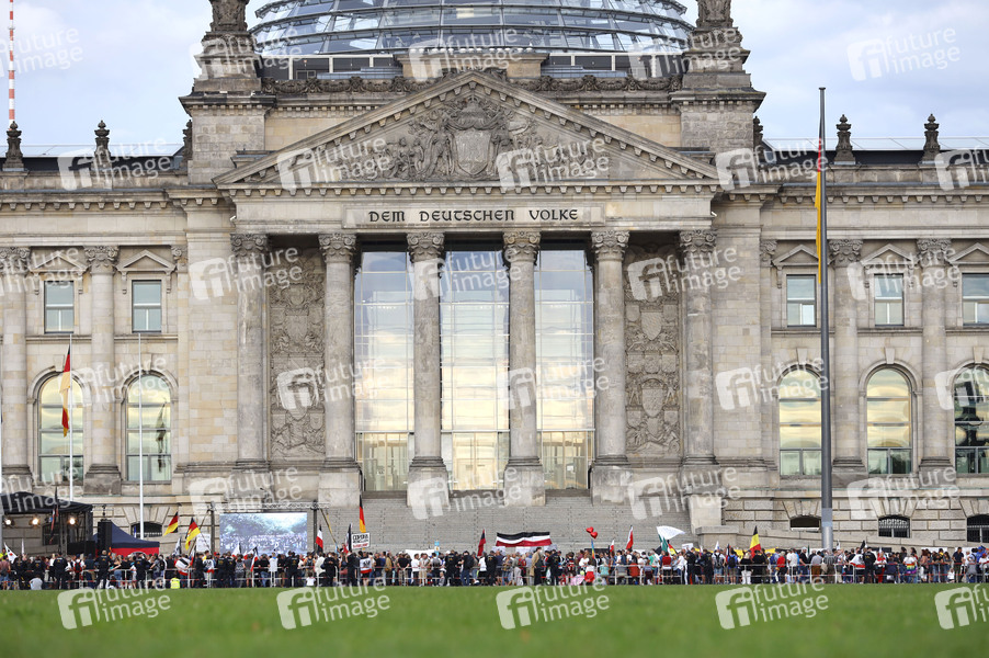 Im Bild die Demo von staatenlos.info am Reichstag. Demonstranten verschiedener Gruppierungen wie etwa der Initiative Querdenken 711 protestierten mit einer Großdemonstration in Berlin gegen die bestehenden Maßnahmen zur Eindämmung der Corona-Pandemie. Wegen Nichteinhaltung der polizeilichen Auflagen wurde die Demonstration durch die Polizei beendet. Es gab Rangeleien und Festnahmen. Berlin, 29.08.2020